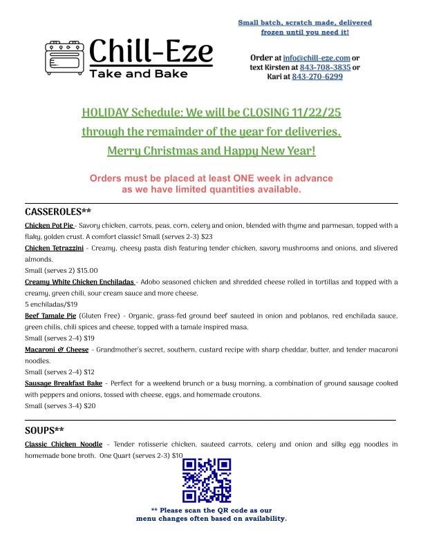 Chill-Eze exists to help! If you’re too busy to cook for your family, yourself, or others you love, we make your life EZE. So love yourself, and others, and just CHILL with us! We are here to help.